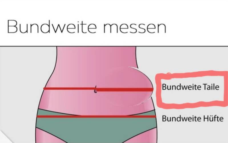Bundmass = Das Mass von der linken Bauchseite zur rechten Bauchseite. Am optimalsten misst du auf der Höhe des Bauchnabels oder 1-2cm darunter.