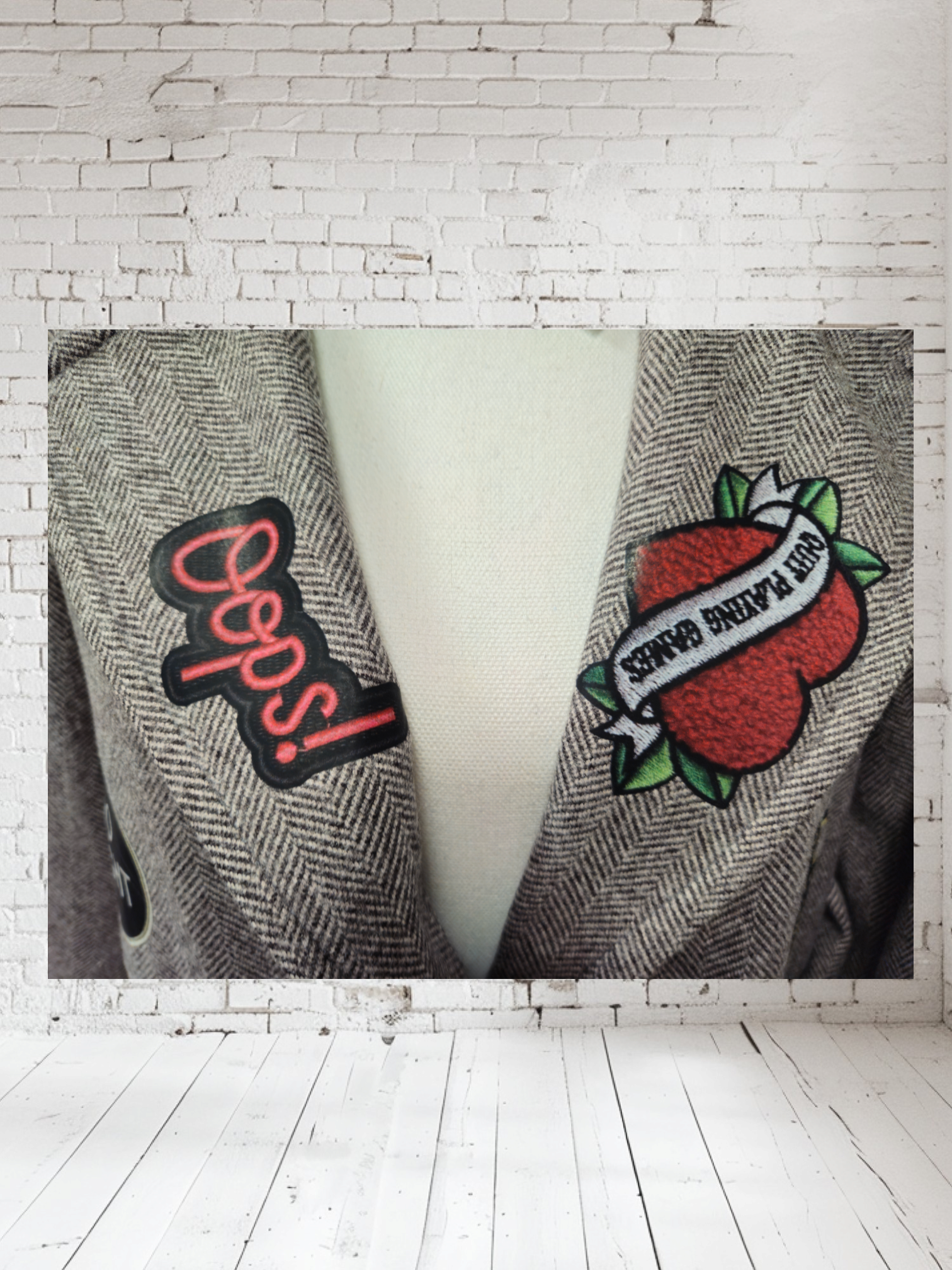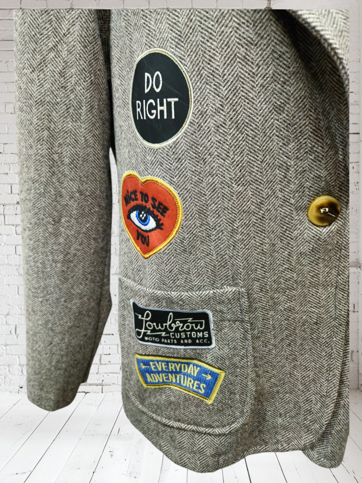 Super kuscheliger Blazer, grau, einerseits klassisch im Fischgrätemuster und gleichzeitig total aufgepeppt mit verschiedenen Patches. Ein Hingucker !!